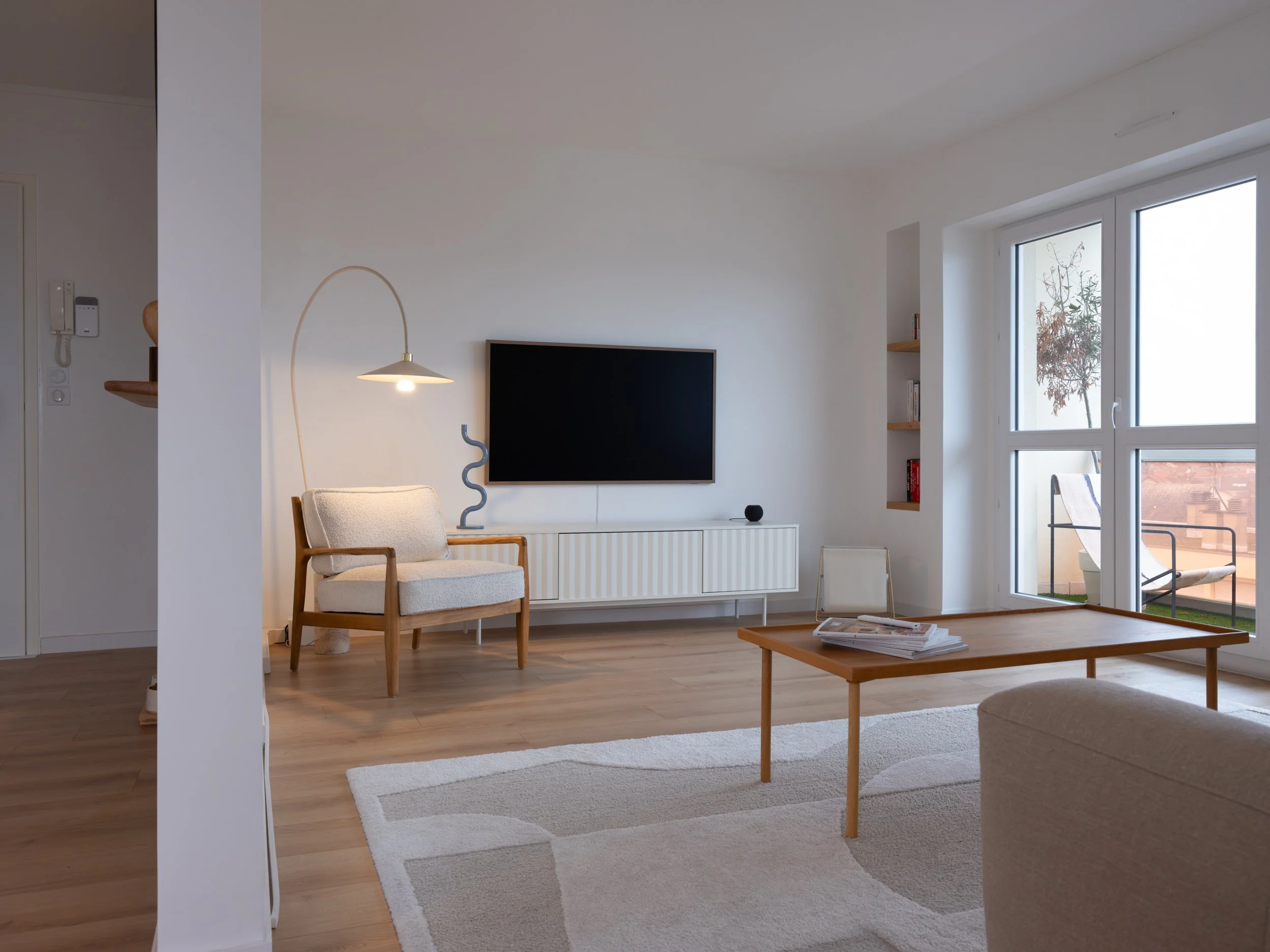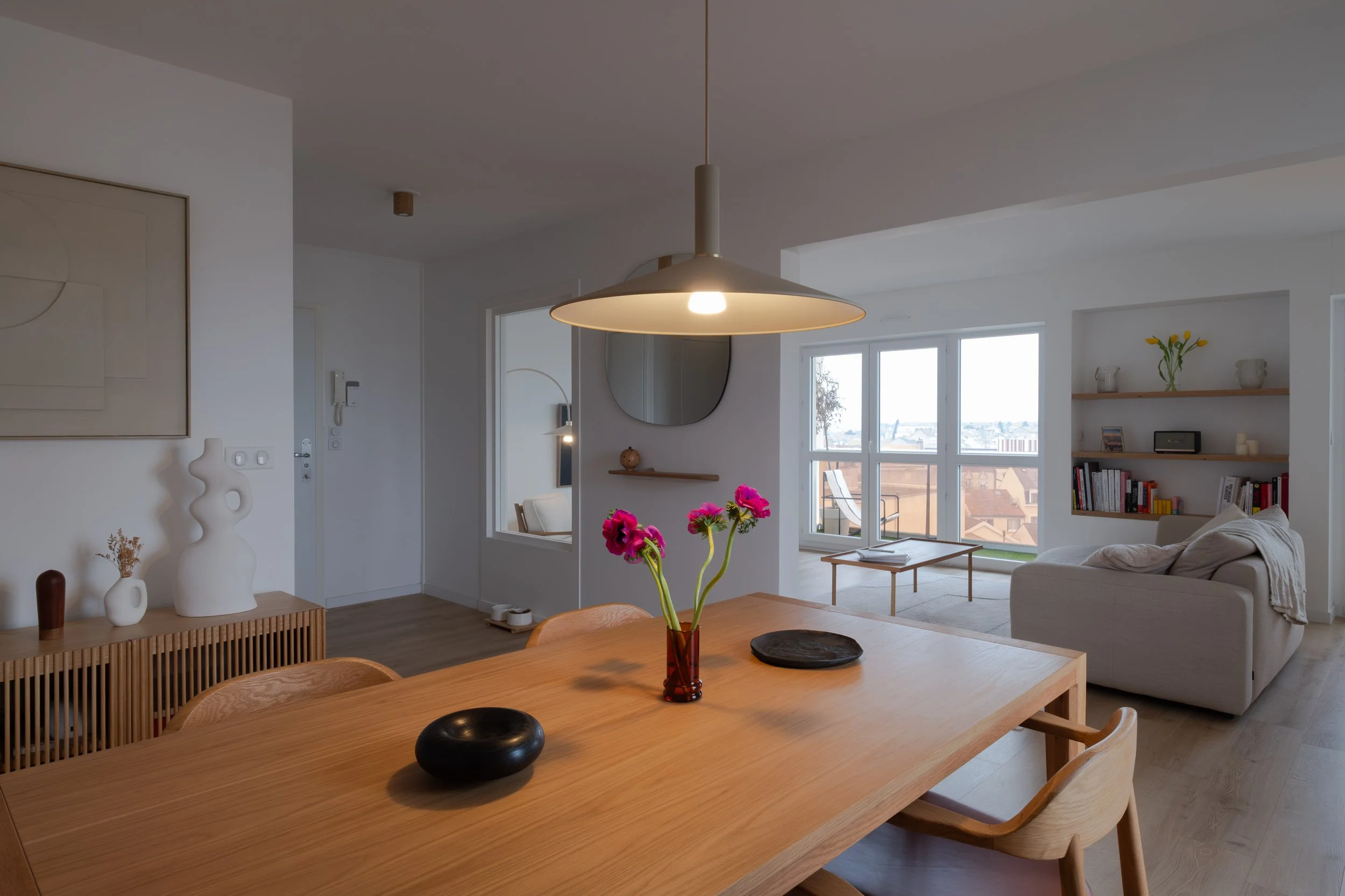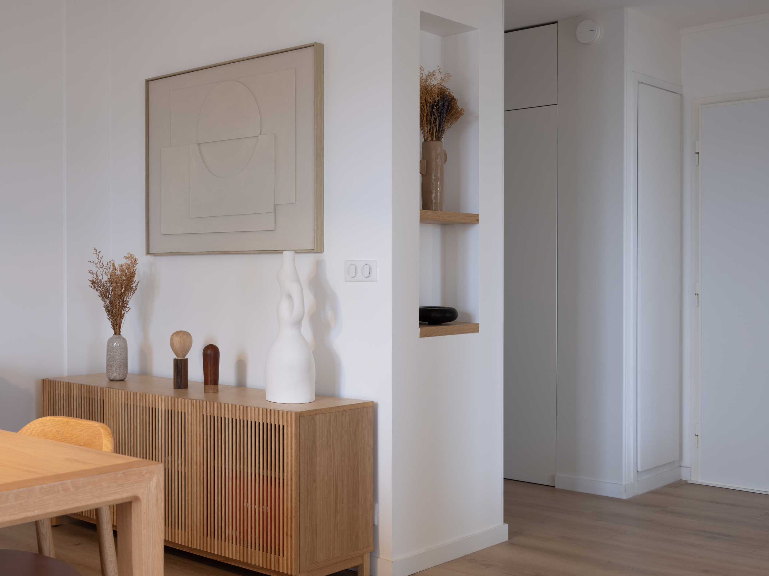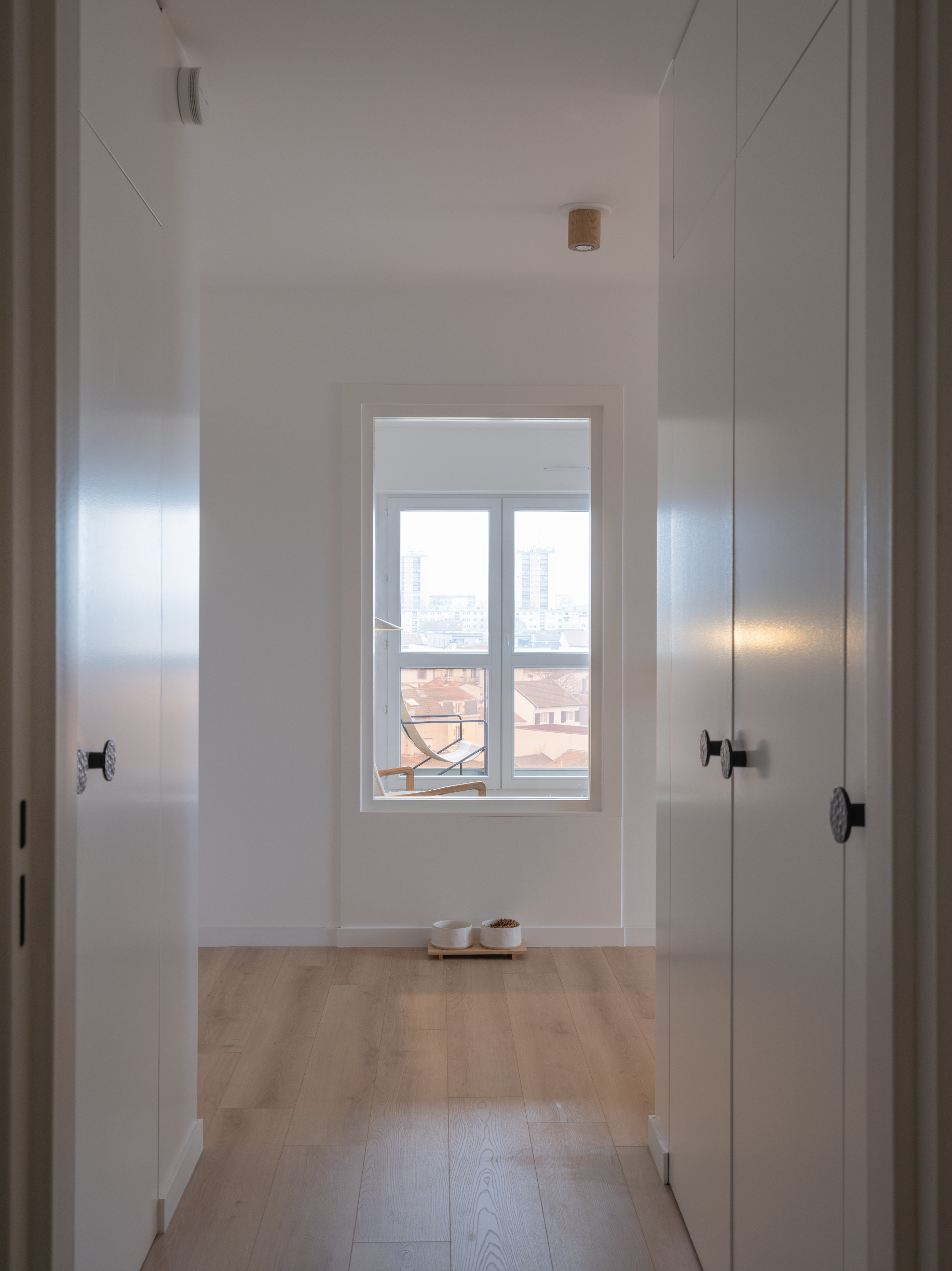 Optimisation des ouvertures sur les espaces de vies pour un maximum de luminosité, l’ancienne porte donnant sur le salon se transforme en baie fixe. Requalification de l’entrée par des rangements toutes hauteurs. Intégration des coffres de volets dans une cloison épaisse offrant des niches.
