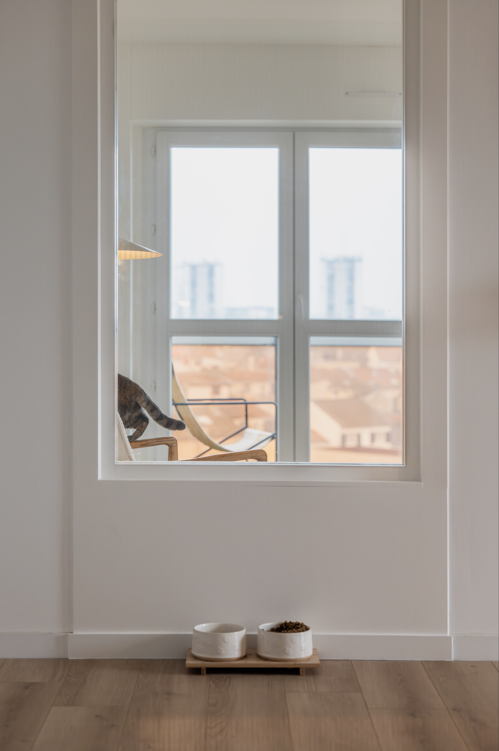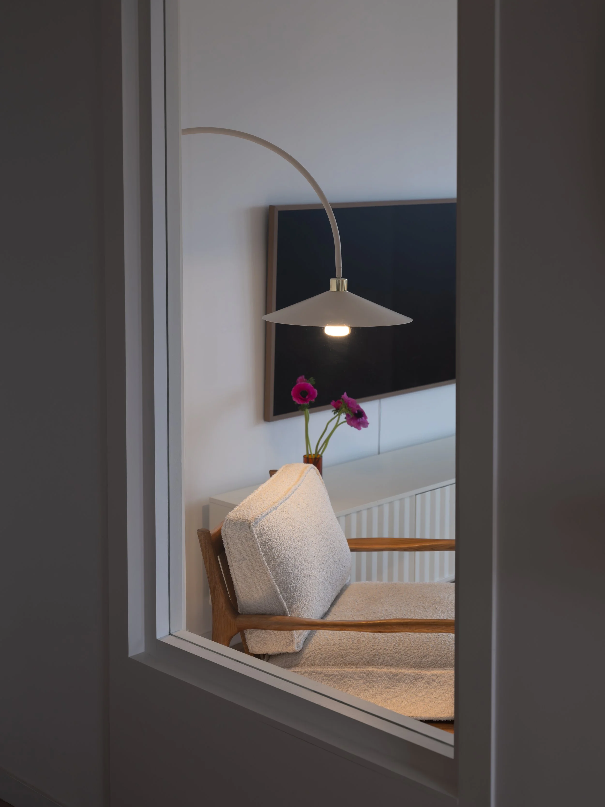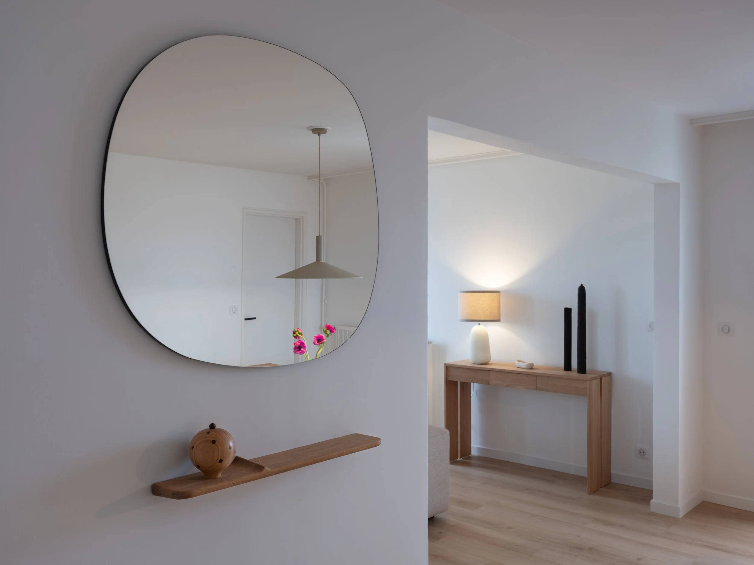 Optimisation des ouvertures sur les espaces de vies pour un maximum de luminosité, l’ancienne porte donnant sur le salon se transforme en baie fixe. Requalification de l’entrée par des rangements toutes hauteurs. Intégration des coffres de volets dans une cloison épaisse offrant des niches.