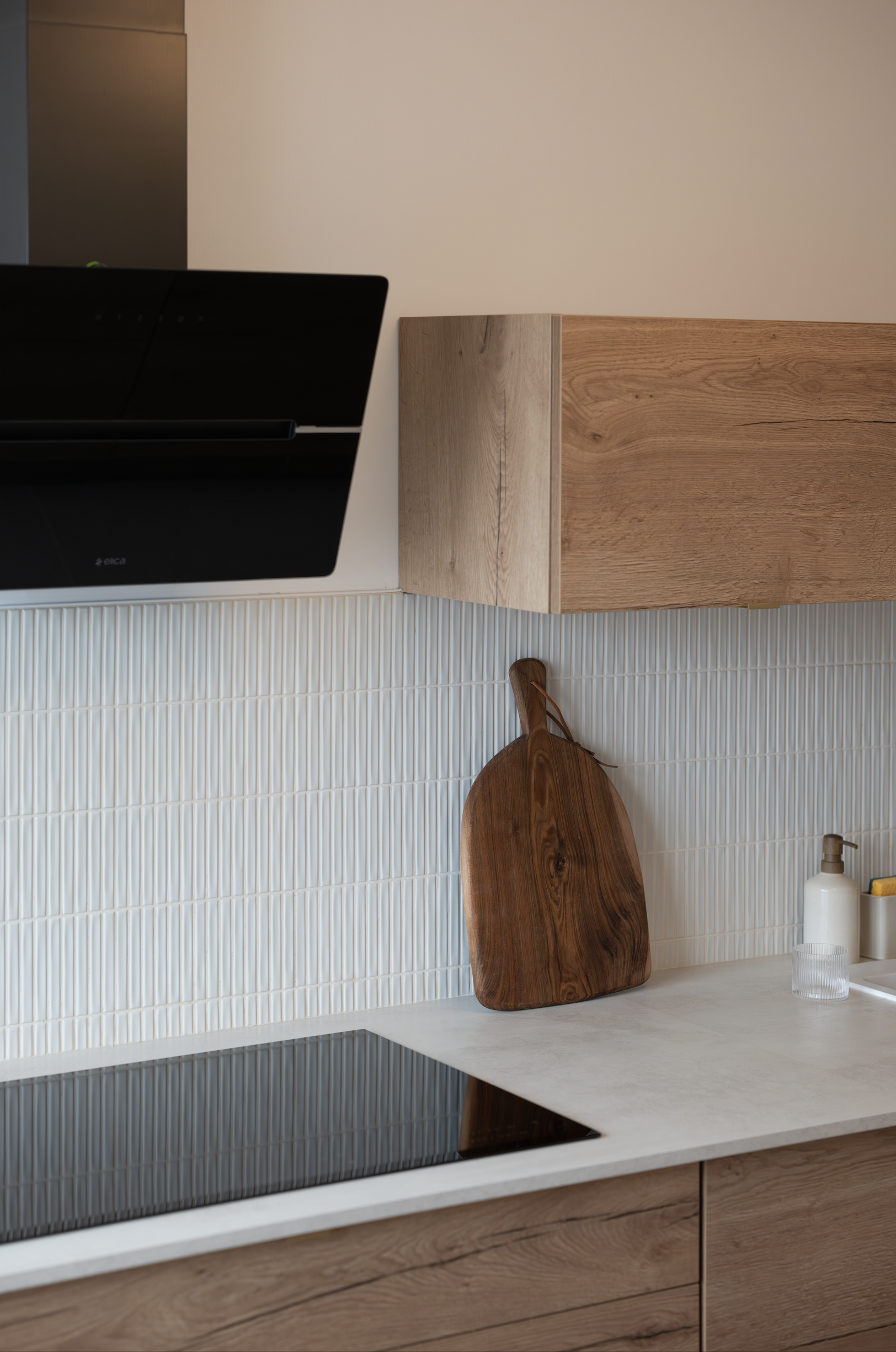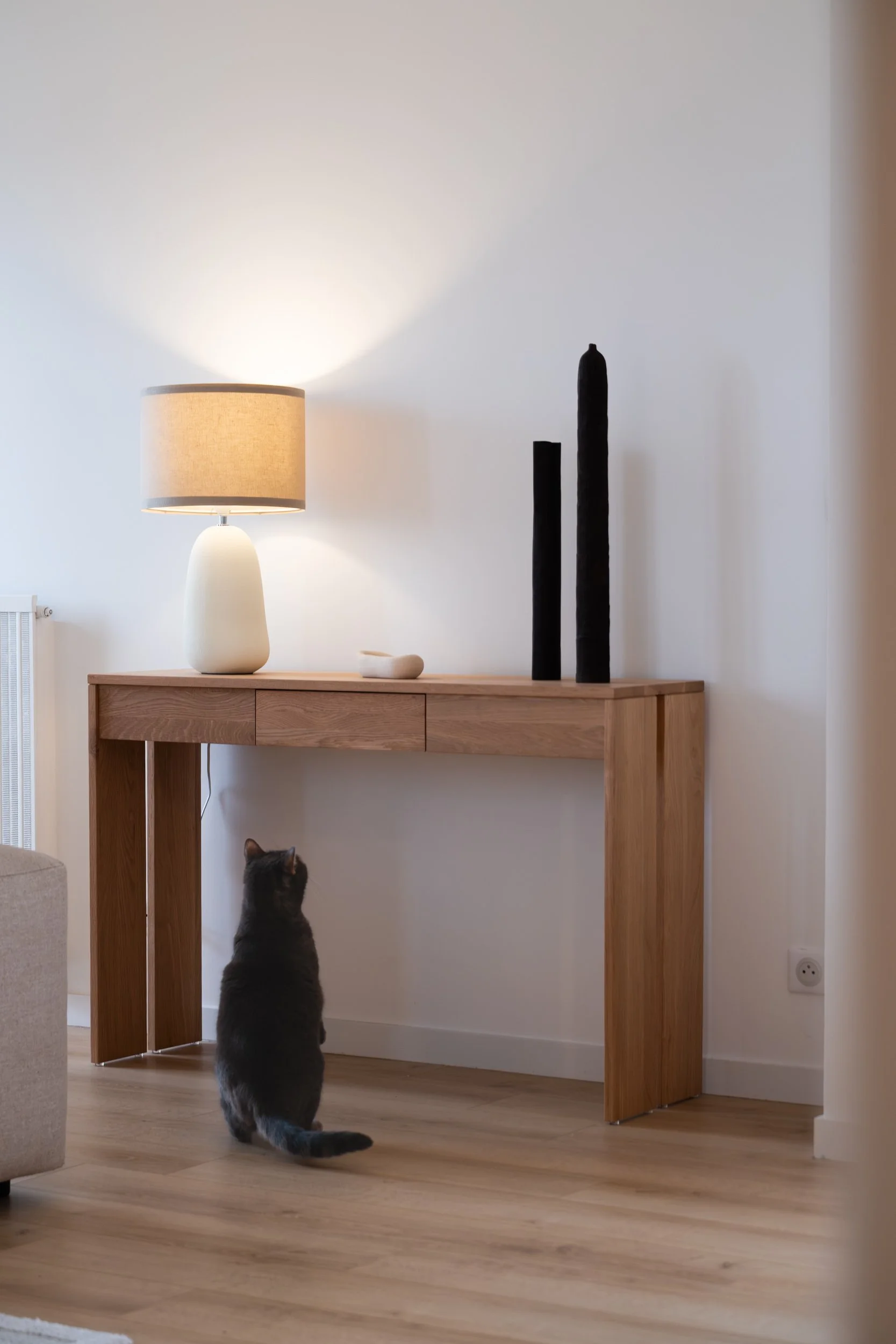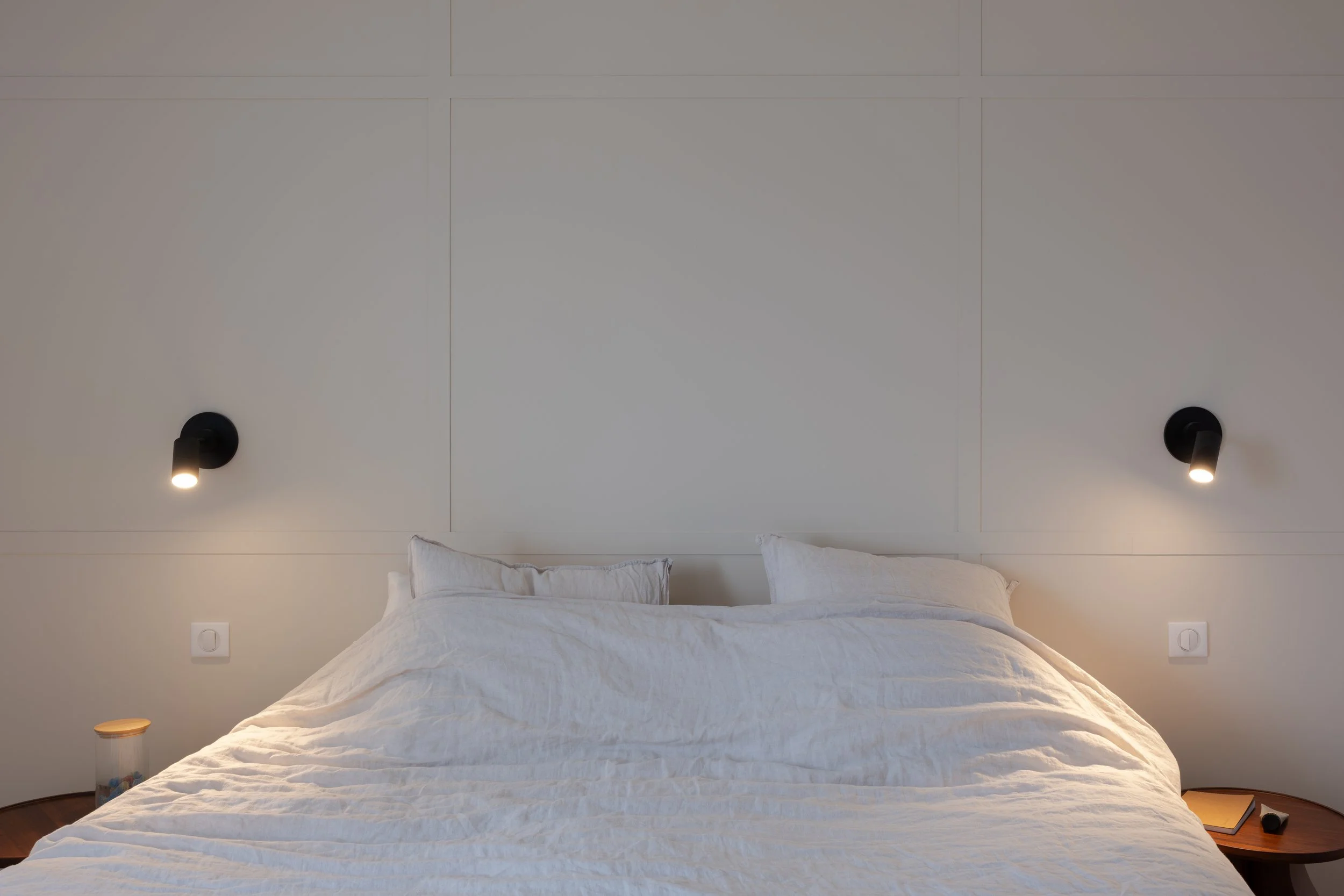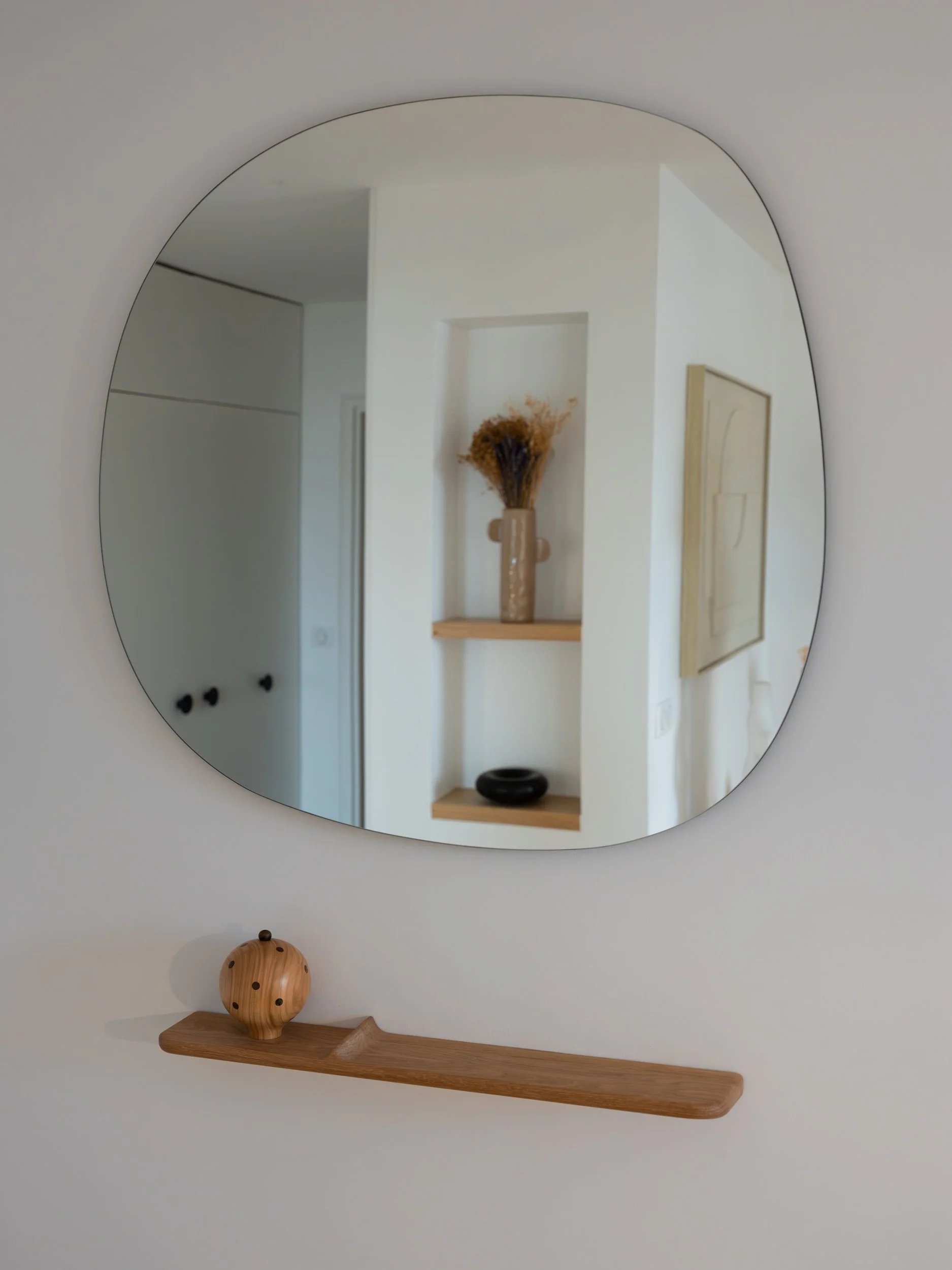 Optimisation des ouvertures sur les espaces de vies pour un maximum de luminosité, l’ancienne porte donnant sur le salon se transforme en baie fixe. Requalification de l’entrée par des rangements toutes hauteurs. Intégration des coffres de volets dans une cloison épaisse offrant des niches.