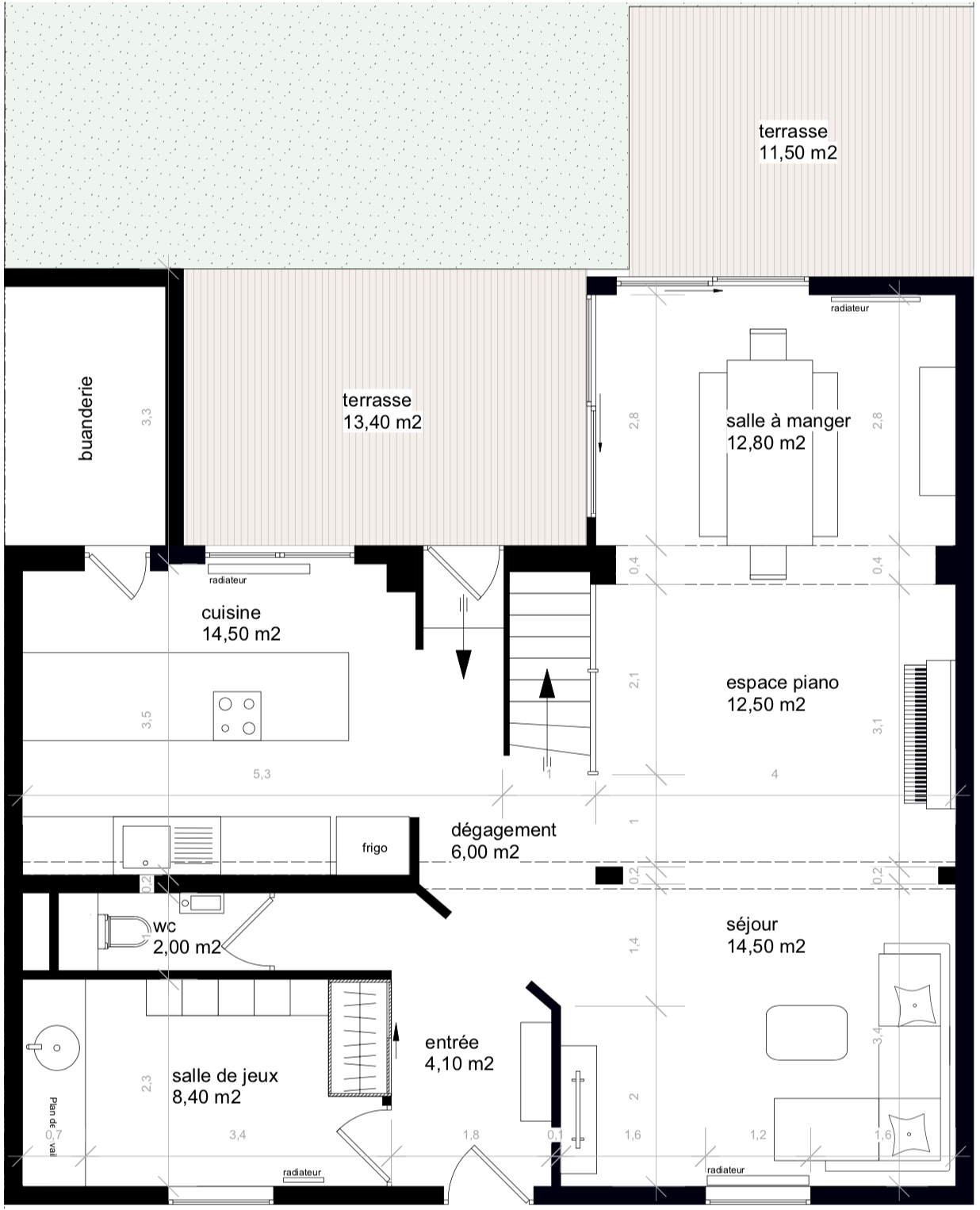 Le dialogue et la confiance avec les clients ont permis de proposer une extension orientée sud et non orientée nord comme sur le plan existant. Cette configuration offre un belle espace extérieur dialoguant avec les pièces de vie intérieur. La répartition simplifiée des espaces permet une organisation fonctionnelle et fluide de la maison.